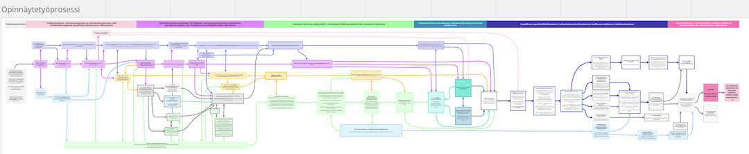 Niin minullakin! Siksi olen tehnyt tyypillisen opinnäytetyöprojektin vaiheista (omalla tylilläni) PERT-kaavion, jossa tehtävät linkitetään toisiinsa ja eri vaiheisiin.
