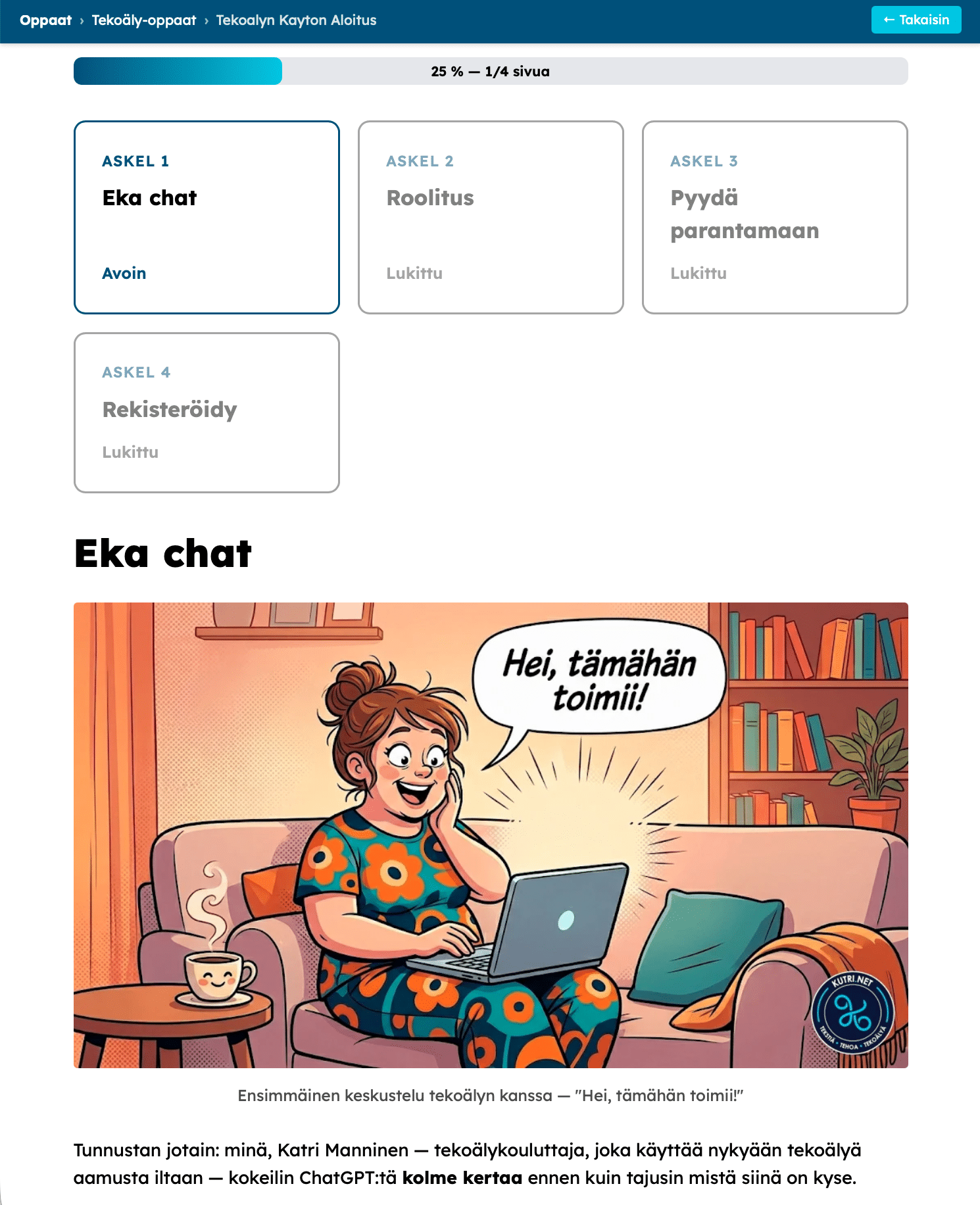 Tutustu Tekoäly Haltuun -jäsenyyteen ilmaiseksi — omaan tahtiin ja selkokielellä.