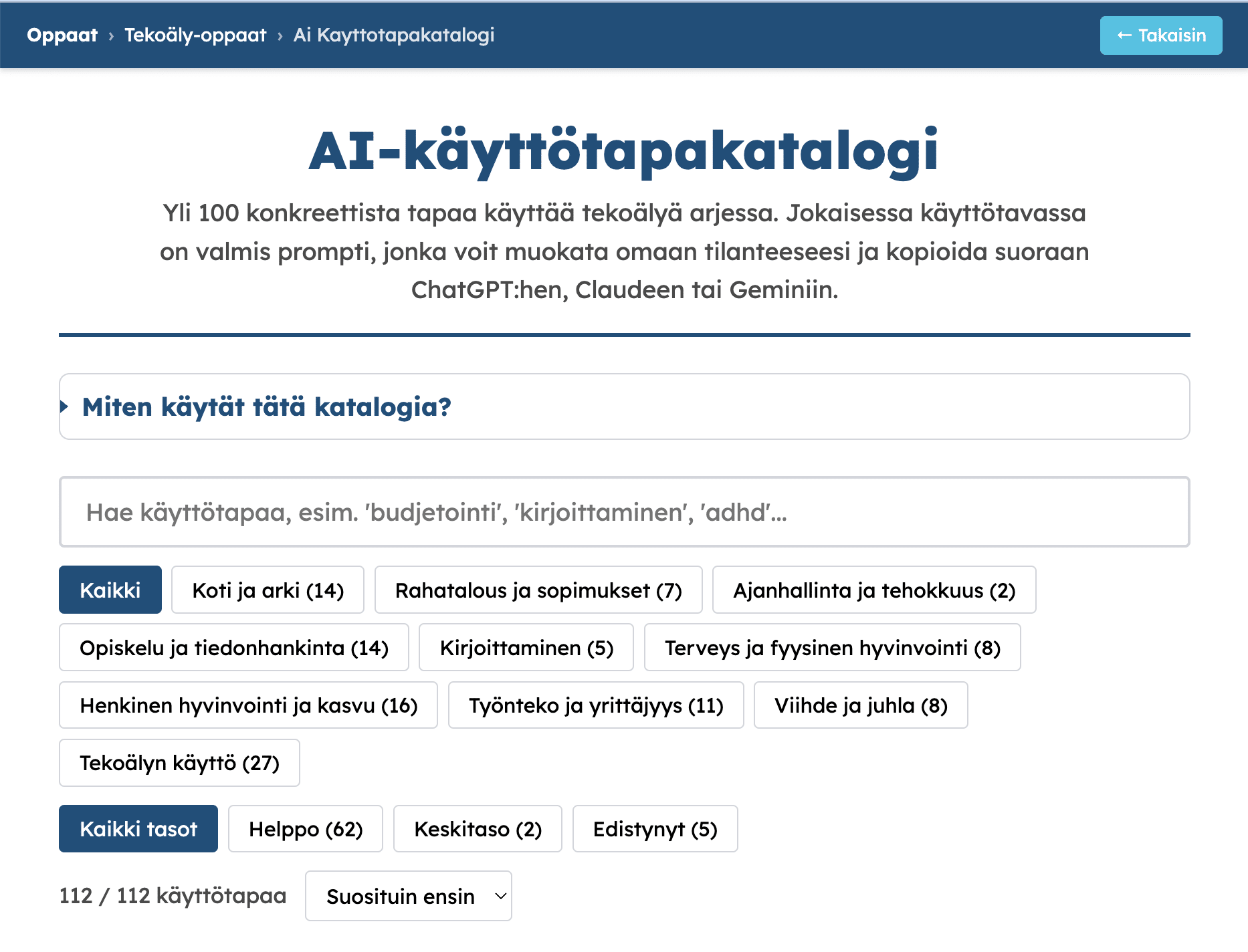 Selaa kategorioittain, kopioi promptit suoraan ja kokeile itse. Enää sinun ei tarvitse miettiä “mihin tätä käyttäisi”.
