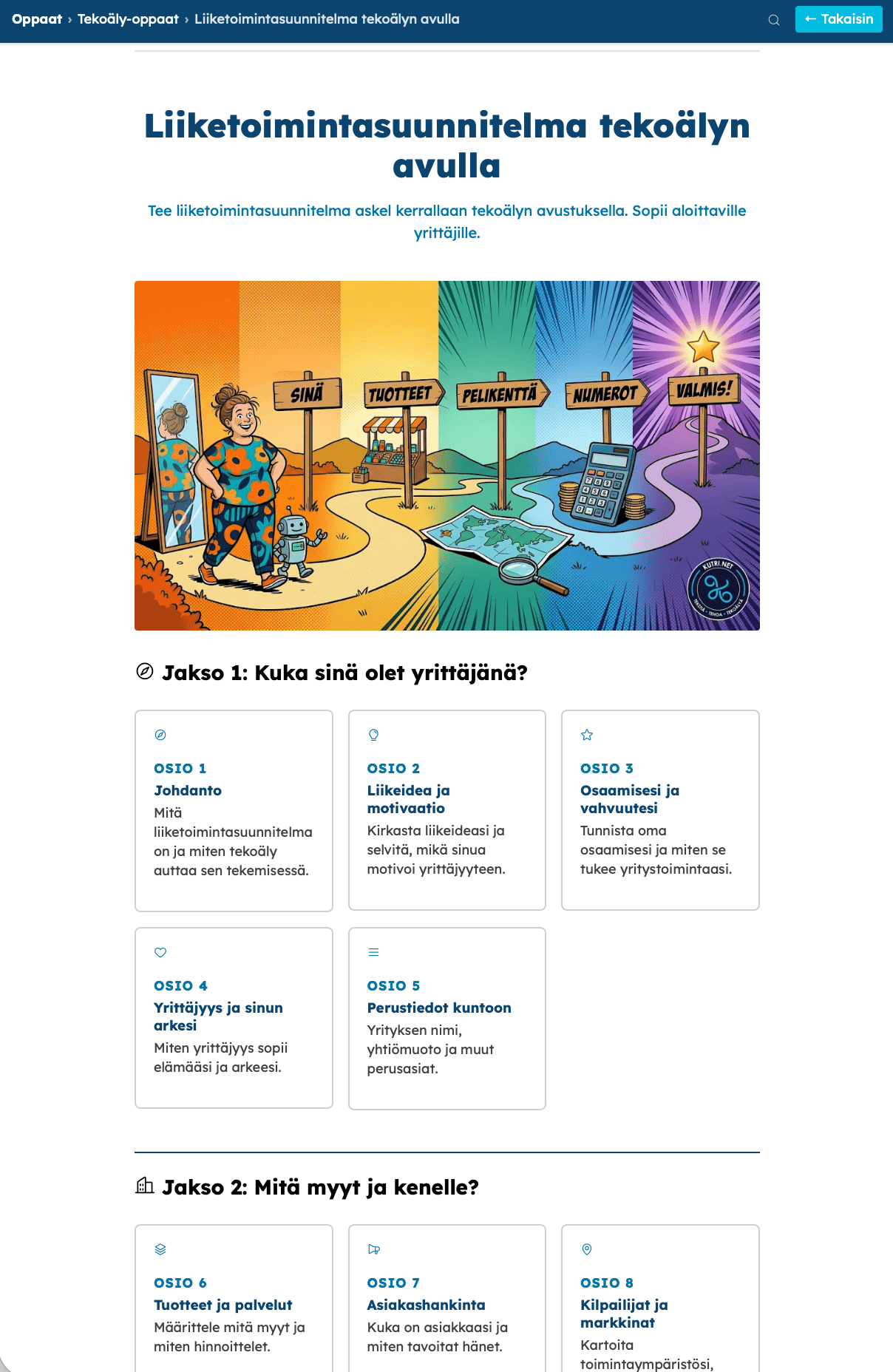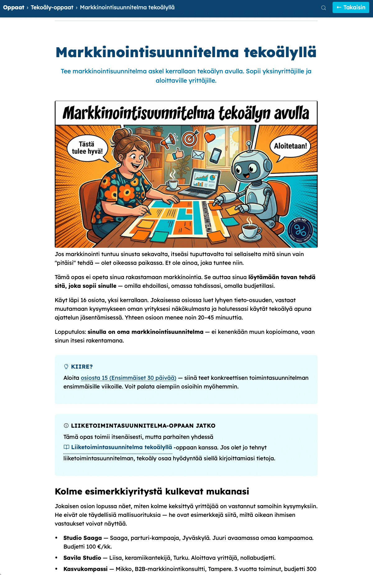 Monisivuiset, interaktiiviset oppaat, joista voit käydä lukemassa juuri ne osat, jotka sinua kiinnostavat. Vaikeatkin asiat on purettu niin pieniin palasiin, että ne mahtuvat kahvitauolle. Oppaissa voit vastata kysymyksiin, kopioida valmiita prompteja ja täytellä harjoituksia.