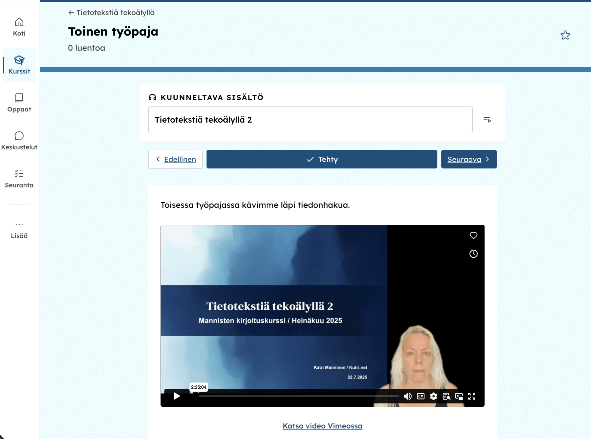 • Tietotekstiä tekoälyllä (arvo 149 €) — Opi tuottamaan laadukasta tietotekstiä tekoälyn avulla. Kesän 2025 suositun työpajan tallenteet (3 × 2 h).