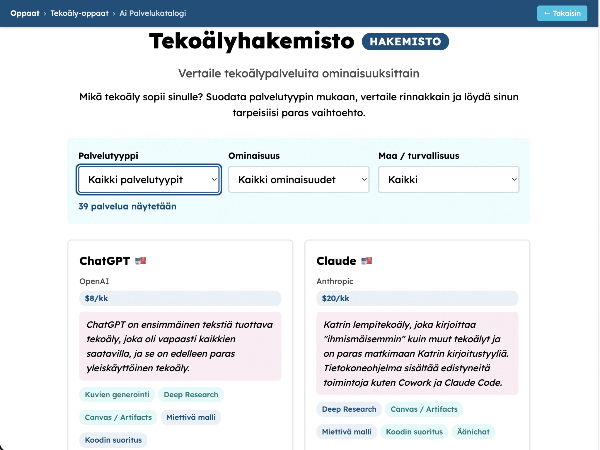 Hakemistot päivittyvät säännöllisesti — sinun ei tarvitse itse googlata mikä palvelu osaa mitäkin. Tekoälypalveluhakemistossa voit vertailla ChatGPT:n, Clauden, Geminin ja Copilotin ominaisuuksia vierekkäin ja valita juuri sinulle sopivan.